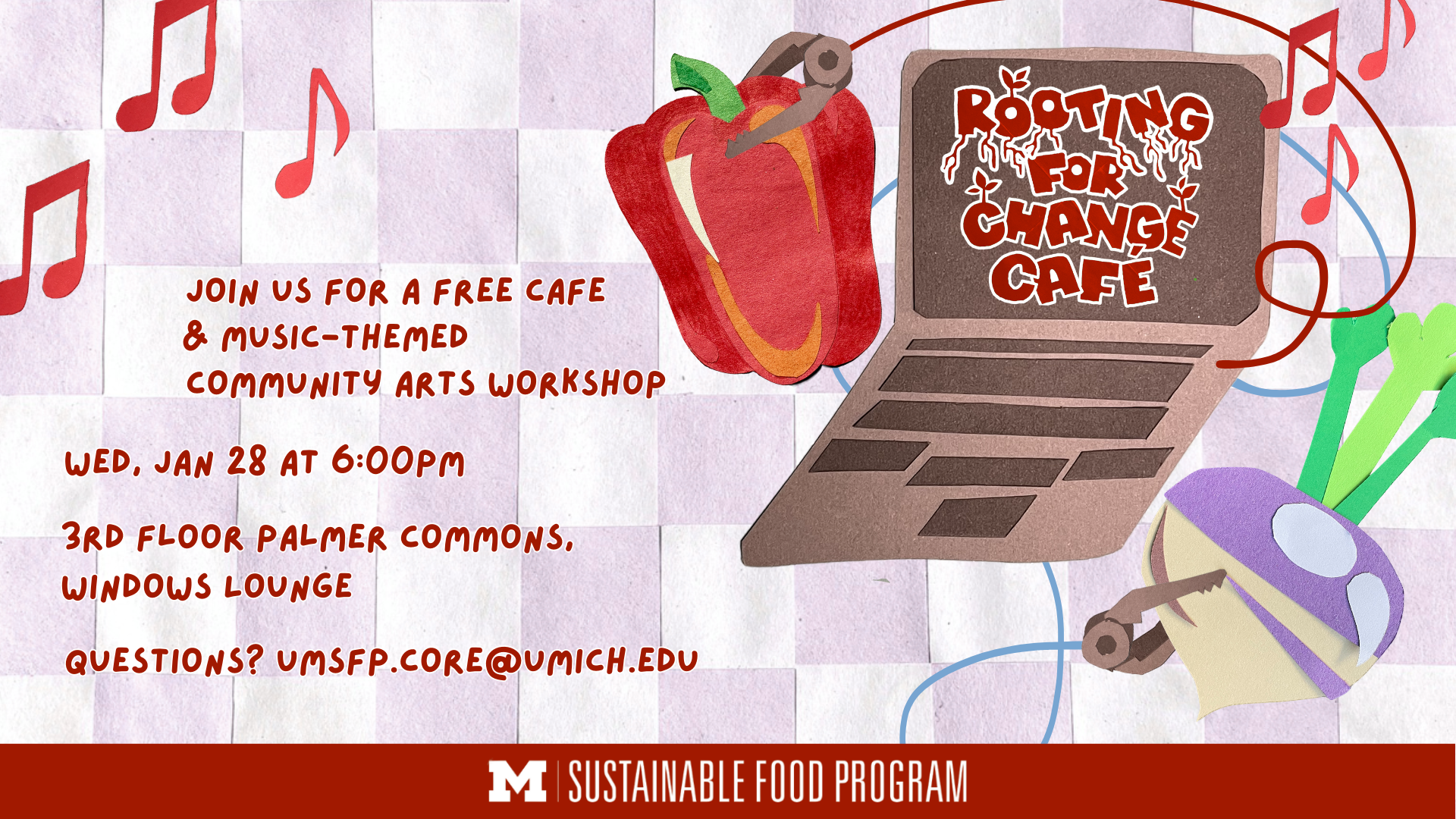 Cafe and Workshop Event slide Campaign Dates Thu, 01/22/2026 - 00:00 - Wed, 01/28/2026 - 23:59 Display Groups ITS Sites Print Queue Displays University Unions Organization UM Sustainable Food Program Contract Number AW26132a Read more about Cafe and Workshop Event