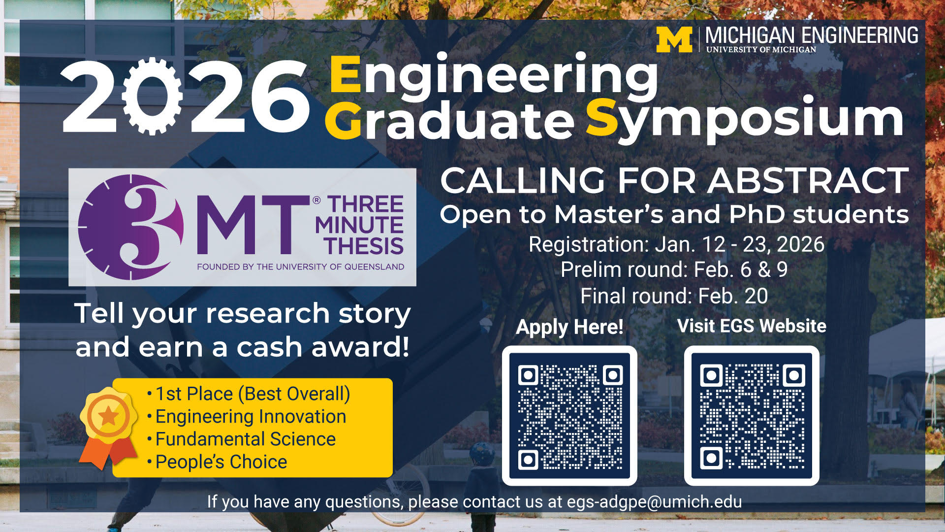 Engineering Symposium slide Campaign Dates Tue, 01/20/2026 - 00:00 - Thu, 01/22/2026 - 23:59 Display Groups ITS Sites Print Queue Displays University Unions Organization Office of the Associate Dean for Graduate and Professional Education Contract Number AW26124 Read more about Engineering Symposium